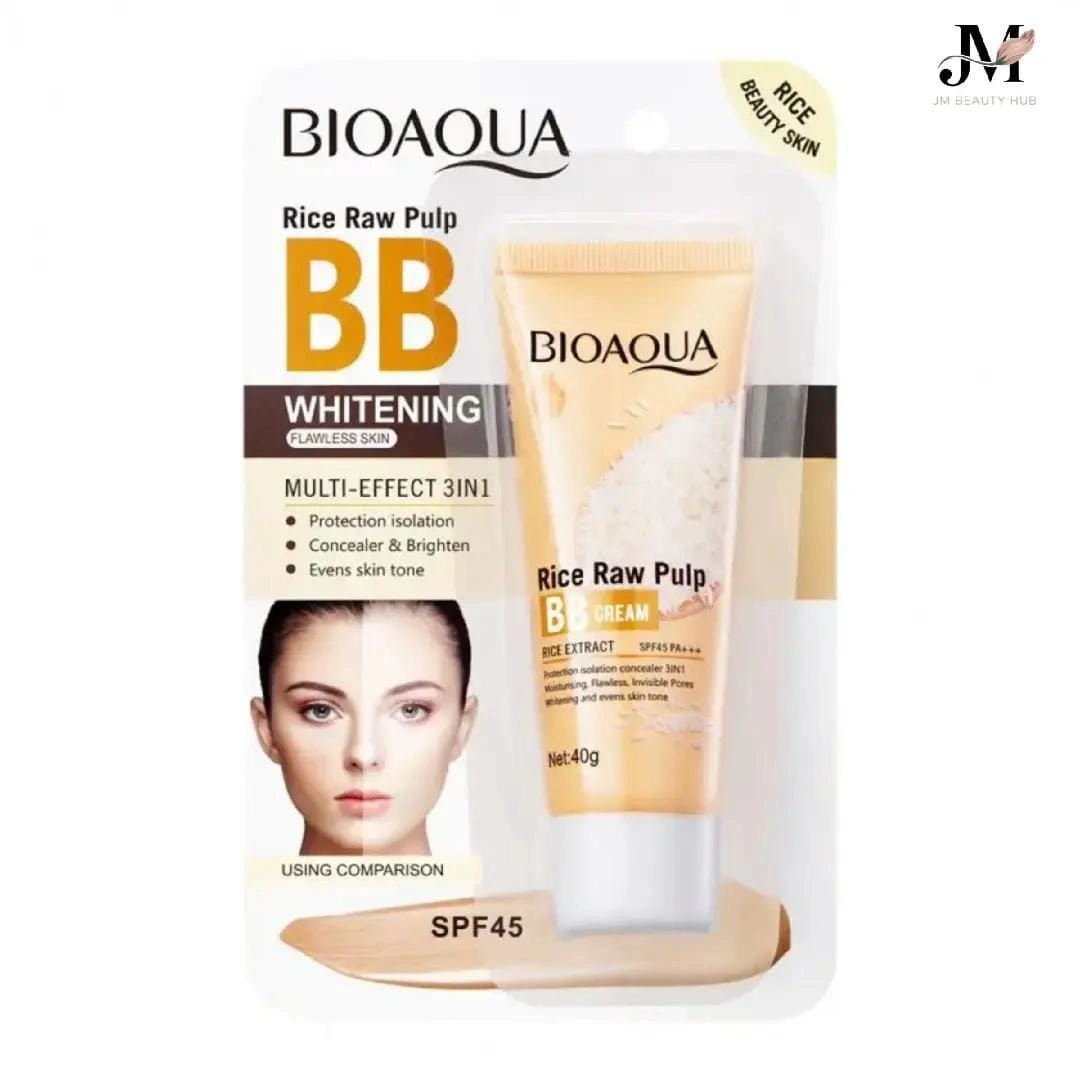 BIOAQUA Rice Raw Pulp BB Cream Whitening SPF45 is a multi-functional beauty balm designed to enhance your complexion while nourishing your skin. Formulated with natural rice extract, it deeply hydrates and brightens the skin, helping to reduce dullness and uneven tone.