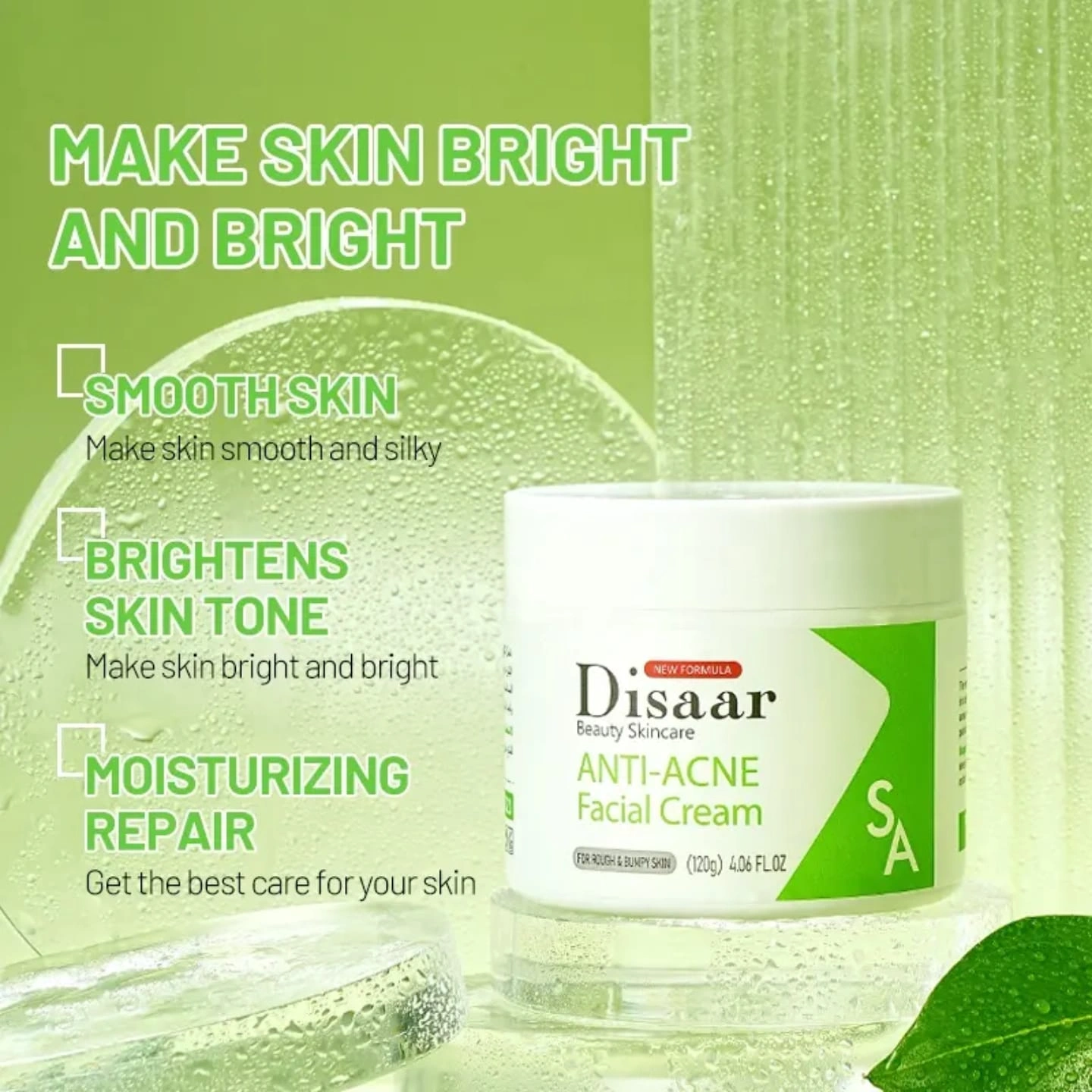 Disaar Beauty Skincare Anti-Acne Facial Cream is a targeted treatment cream specially formulated to control acne, reduce inflammation, and fade acne marks. Enriched with soothing and repairing ingredients, it helps calm irritated skin while promoting a smoother, clearer, and healthier complexion. Suitable for rough and bumpy skin, this cream provides both anti-acne benefits and deep moisturization.