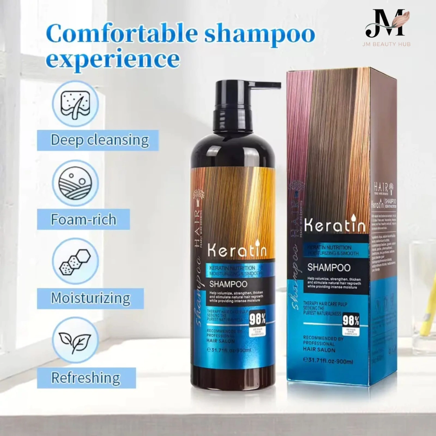 Experience salon-quality hair care at home with the Keratin Nutrition Moisturizing & Smooth Shampoo. Enriched with 98% natural ingredients, this formula delivers essential keratin proteins that rebuild and reinforce the hair structure, helping to reduce breakage and restore elasticity.