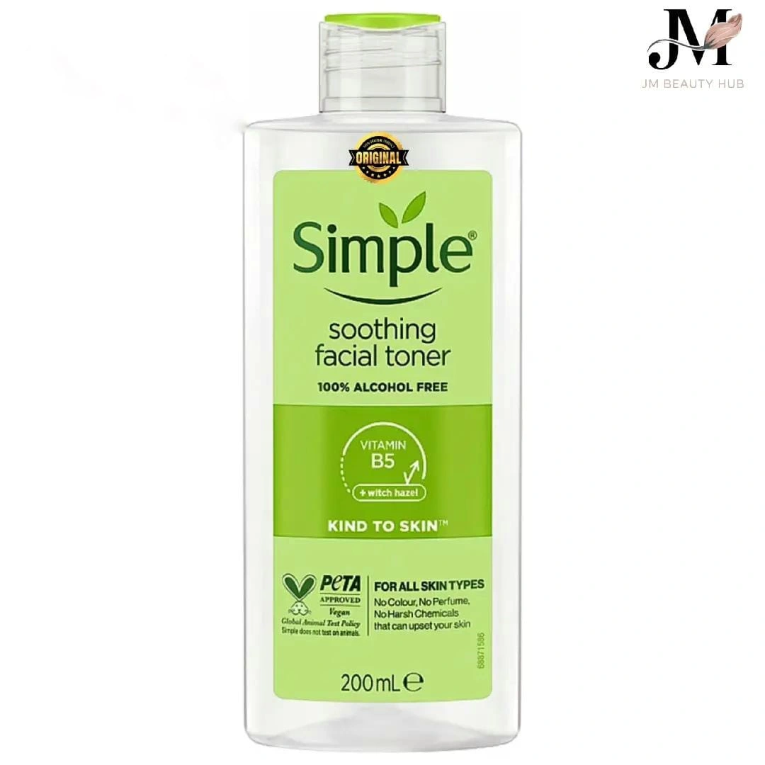Simple Soothing Facial Toner (200ml) is a gentle, 100% alcohol-free toner that helps refresh and balance your skin after cleansing. Enriched with Vitamin B5 and Witch Hazel, it helps to soothe, soften, and tone the skin while maintaining its natural moisture balance. Perfect for all skin types, including sensitive skin.