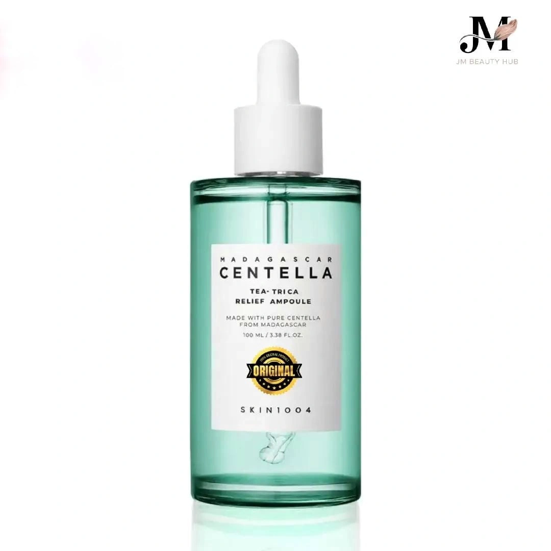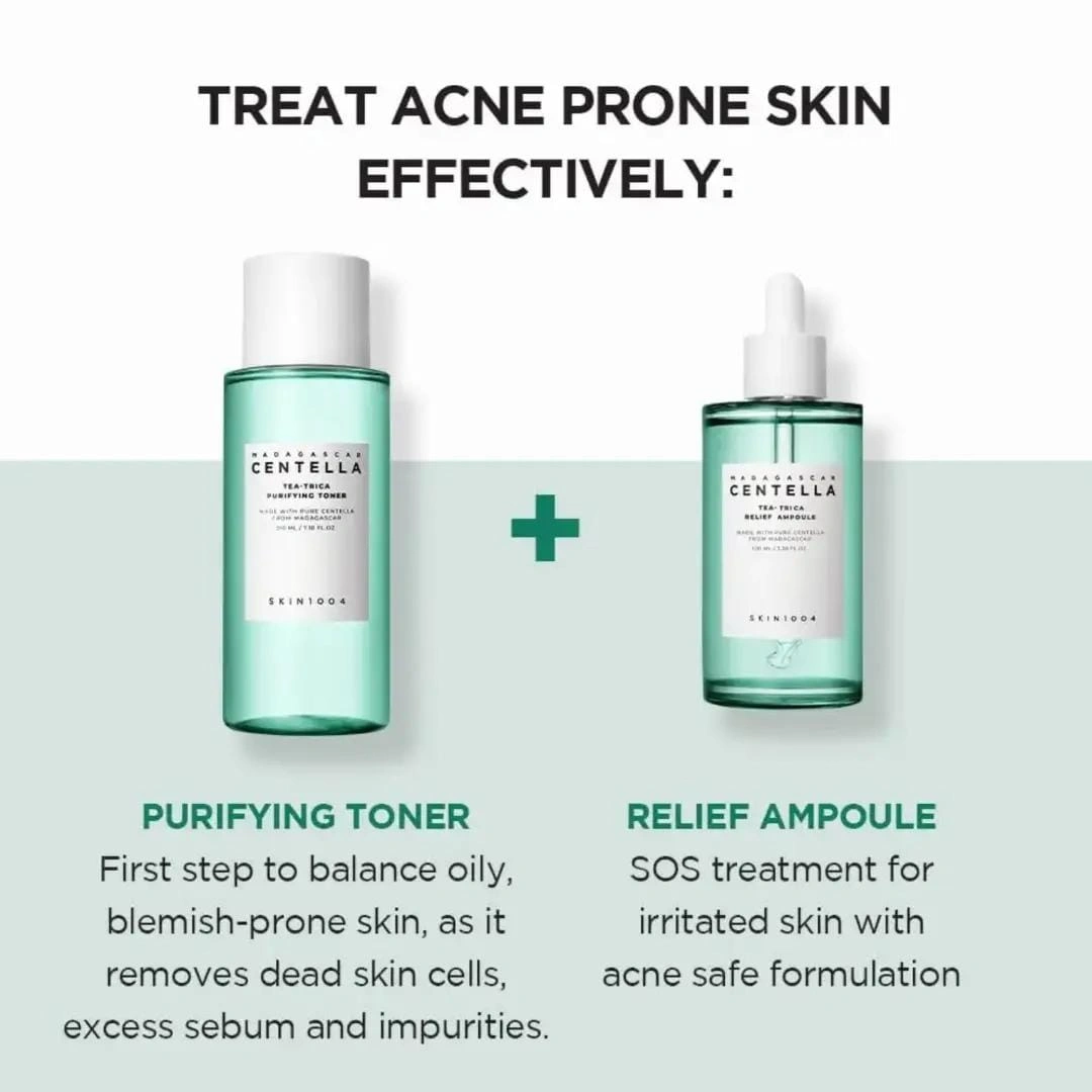SKIN1004 Madagascar Centella Tea-Trica Relief Ampoule is a calming and soothing serum formulated with pure Centella Asiatica extract from Madagascar and Tea Tree ingredients. It helps to relieve irritated skin, balance excess sebum, and strengthen the skin barrier, leaving your skin clear, hydrated, and refreshed.