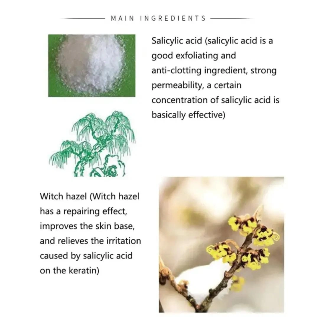 Aqua (Water), Salicylic Acid, Hamamelis Virginiana (Witch Hazel) Water, Pentylene Glycol, Polysorbate 20, Sodium Hyaluronate, Glycerin, and other supporting ingredients to maintain pH and stability.